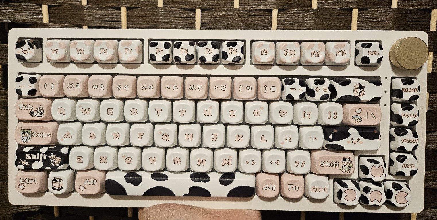 Cinnamonroll akko keyboard 20th anniversary, the keycaps are swapped to cute cow print style. Keyboard works perfectly, the white base of the Keyboard is a little faded but nothing really noticeable. Lights up , will include wire.